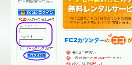 FC2ID登録時のメールアドレスとパスワードを入力して[ログイン]をクリック