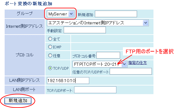 ここでは、FTP用のポートのポートのアドレス変換を例にしております。