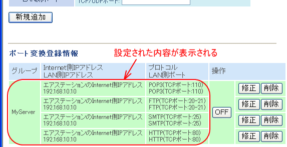 アドレス変換を登録した内容は下段に表示されます。