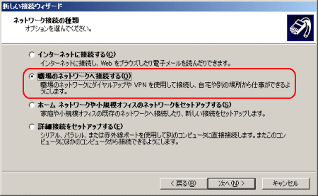 「職場のネットワークへ接続する(O)」にチェックを入れて[次へ(N)>]をクリック
