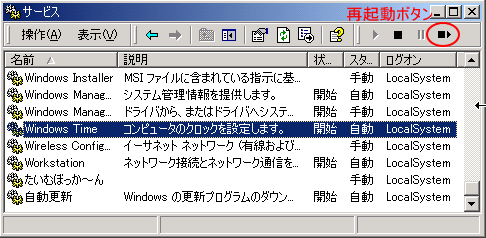 [Windows Time]を選択した状態で「再起動ボタン」をクリックするか、