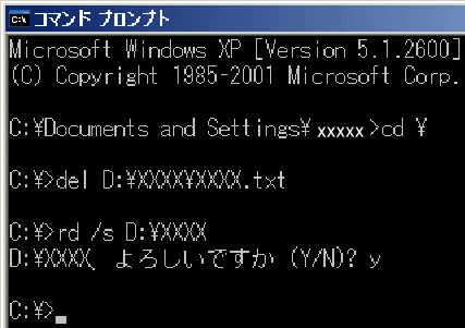 注)「rd /s 」の場合にはよろしいですか(Y/N)?と表示されるので「y」と入力してEnter