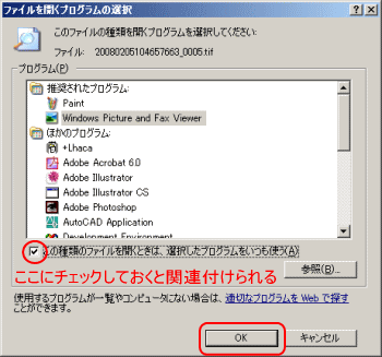 ここで、「この種類のファイルを開くときは、選択したプログラムをいつも使う(A)」に